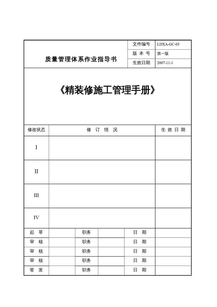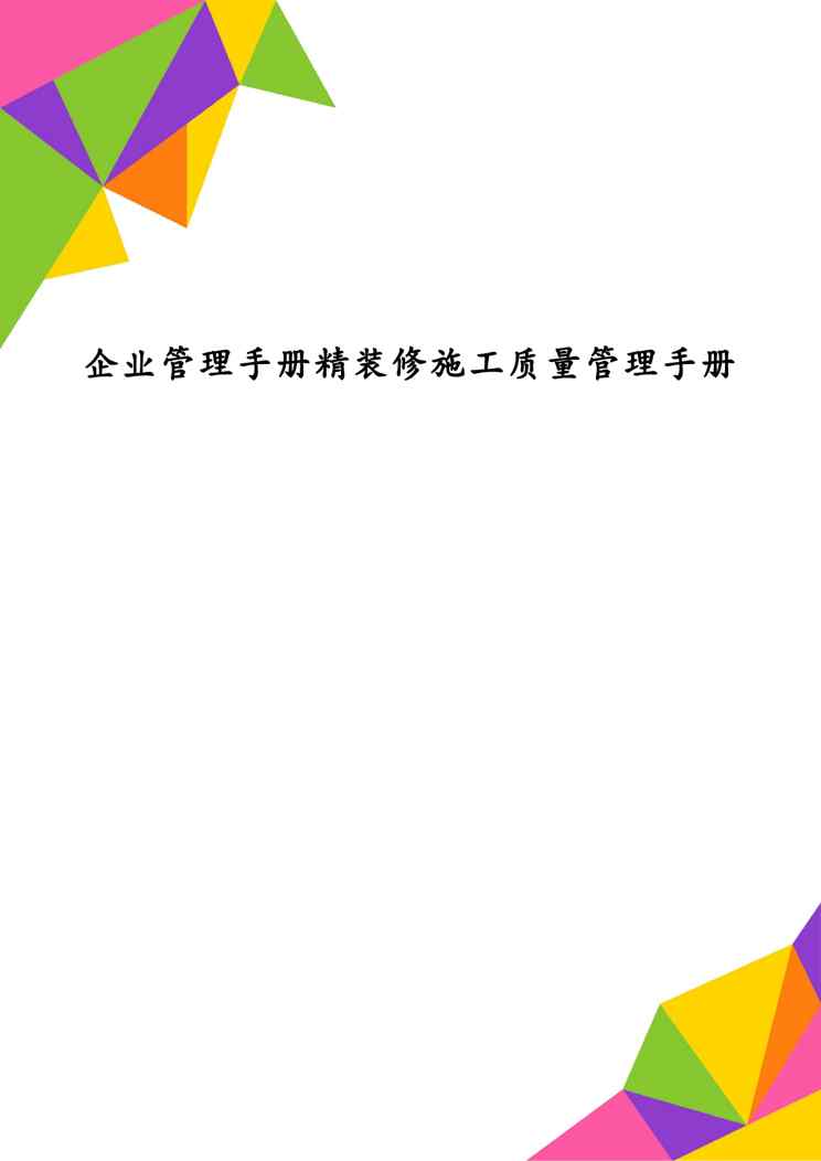 本站正式发布了《企业管理手册精装修施工质量管理手册》文档,文档详细内容可下载阅读。 声明:本站所有文章,如无特殊说明或标注,均为本站原创发布。任何个人或组织,在未征得本站同意时,禁止复制、盗用、采集、发布本站内容到任何网站、书籍等各类媒体平台。如若本站内容侵犯了原著者的合法权益,可联系我们进行处理。