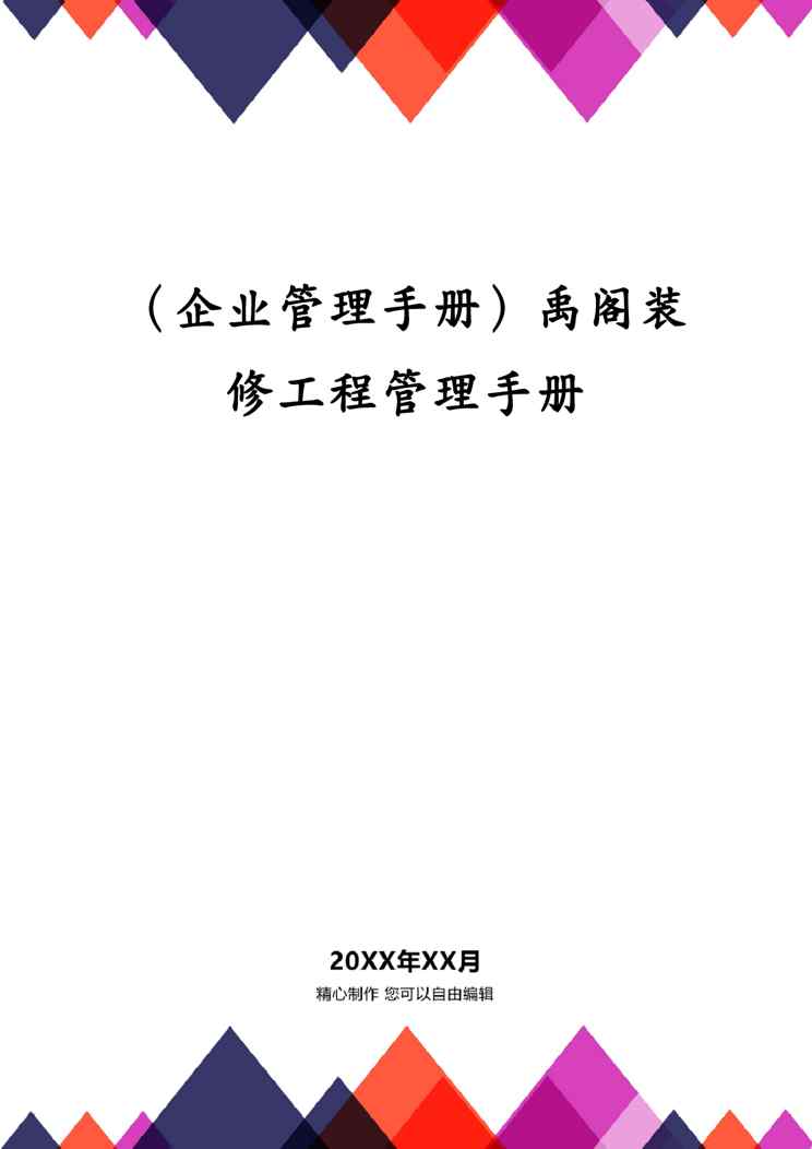 本站正式发布了《企业管理手册禹阁装修工程管理手册》文档,文档详细内容可下载阅读。 声明:本站所有文章,如无特殊说明或标注,均为本站原创发布。任何个人或组织,在未征得本站同意时,禁止复制、盗用、采集、发布本站内容到任何网站、书籍等各类媒体平台。如若本站内容侵犯了原著者的合法权益,可联系我们进行处理。
