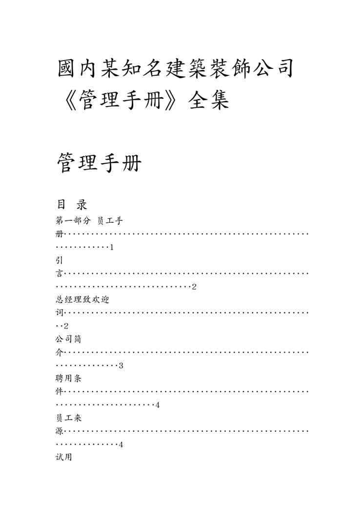 本站资深用户发布了最新的《企业管理手册国内某知名建筑装饰公司管理手册》文档,以下内容为预览,详细内容可下载阅读。 声明:本站所有文章,如无特殊说明或标注,均为本站原创发布。任何个人或组织,在未征得本站同意时,禁止复制、盗用、采集、发布本站内容到任何网站、书籍等各类媒体平台。如若本站内容侵犯了原著者的合法权益,可联系我们进行处理。