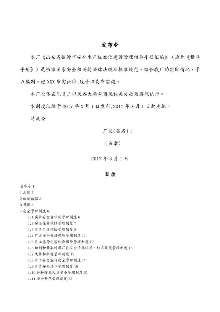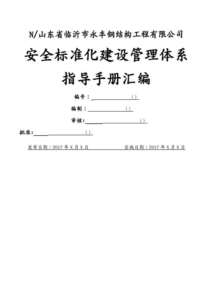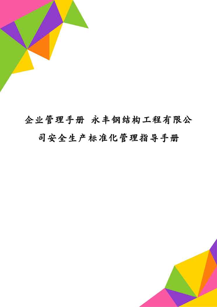 不久前,最新文档《企业管理手册 永丰钢结构工程有限公司安全生产标准化管理指导手册》全文正式在本站发布,感兴趣的用户可以下载阅读。 声明:本站所有文章,如无特殊说明或标注,均为本站原创发布。任何个人或组织,在未征得本站同意时,禁止复制、盗用、采集、发布本站内容到任何网站、书籍等各类媒体平台。如若本站内容侵犯了原著者的合法权益,可联系我们进行处理。