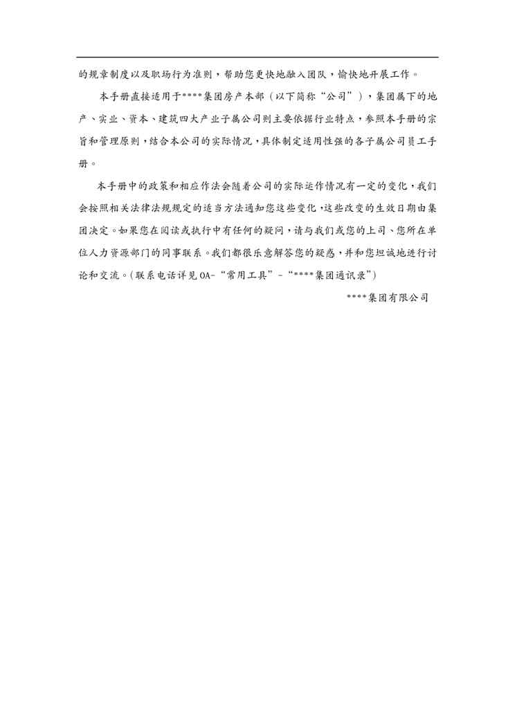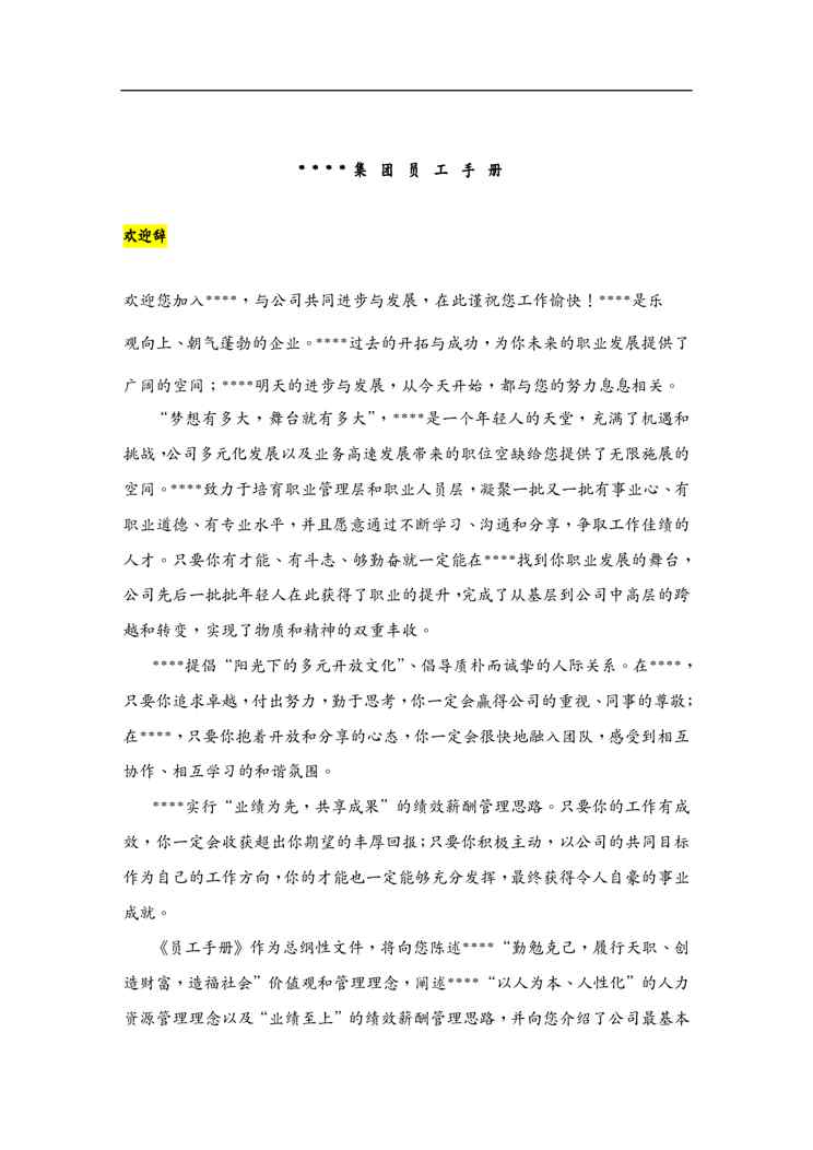 本站资深用户发布了最新的《企业管理手册 某建筑地产公司员工手册》文档,以下内容为预览,详细内容可下载阅读。 声明:本站所有文章,如无特殊说明或标注,均为本站原创发布。任何个人或组织,在未征得本站同意时,禁止复制、盗用、采集、发布本站内容到任何网站、书籍等各类媒体平台。如若本站内容侵犯了原著者的合法权益,可联系我们进行处理。