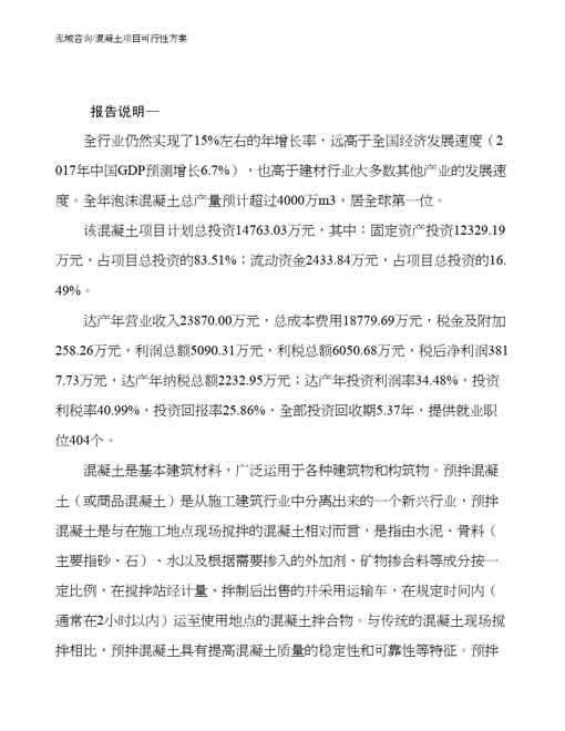 本站资深用户发布了最新的《混凝土项目可行性方案范文模板》文档,以下内容为预览,详细内容可下载阅读。 声明:本站所有文章,如无特殊说明或标注,均为本站原创发布。任何个人或组织,在未征得本站同意时,禁止复制、盗用、采集、发布本站内容到任何网站、书籍等各类媒体平台。如若本站内容侵犯了原著者的合法权益,可联系我们进行处理。