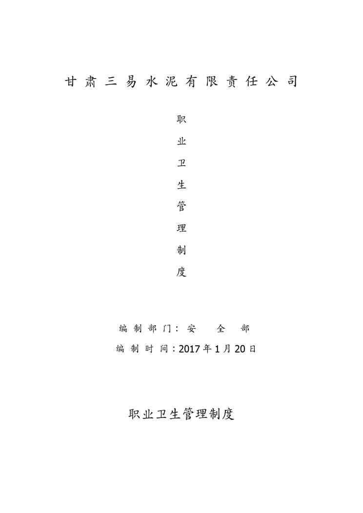 不久前,最新文档《企业管理制度某水泥公司职业卫生规章制度汇编》全文正式在本站发布,感兴趣的用户可以下载阅读。 声明:本站所有文章,如无特殊说明或标注,均为本站原创发布。任何个人或组织,在未征得本站同意时,禁止复制、盗用、采集、发布本站内容到任何网站、书籍等各类媒体平台。如若本站内容侵犯了原著者的合法权益,可联系我们进行处理。