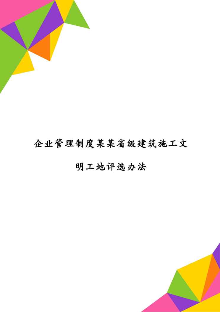 本站资深用户发布了最新的《企业管理制度某某省级建筑施工文明工地评选办法》文档,以下内容为预览,详细内容可下载阅读。 声明:本站所有文章,如无特殊说明或标注,均为本站原创发布。任何个人或组织,在未征得本站同意时,禁止复制、盗用、采集、发布本站内容到任何网站、书籍等各类媒体平台。如若本站内容侵犯了原著者的合法权益,可联系我们进行处理。