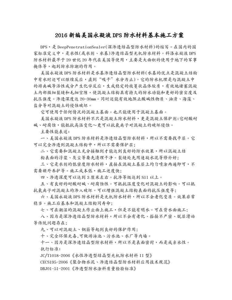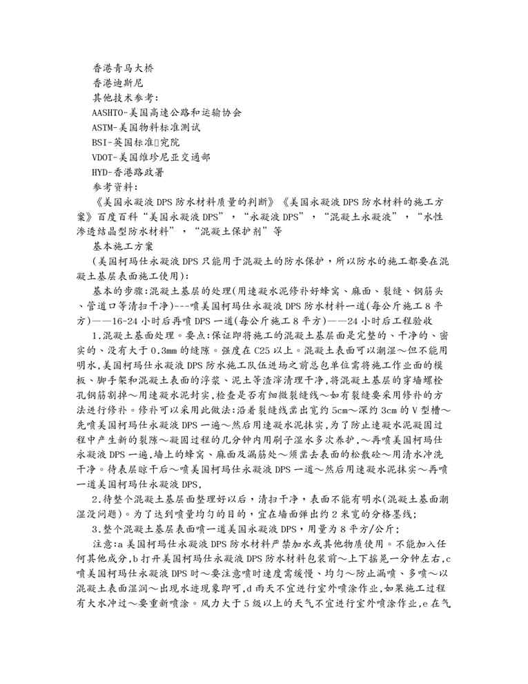 不久前,最新文档《(建筑材料)新编美国永凝液DPS防水材料基本施工方案》全文正式在本站发布,感兴趣的用户可以下载阅读。 声明:本站所有文章,如无特殊说明或标注,均为本站原创发布。任何个人或组织,在未征得本站同意时,禁止复制、盗用、采集、发布本站内容到任何网站、书籍等各类媒体平台。如若本站内容侵犯了原著者的合法权益,可联系我们进行处理。