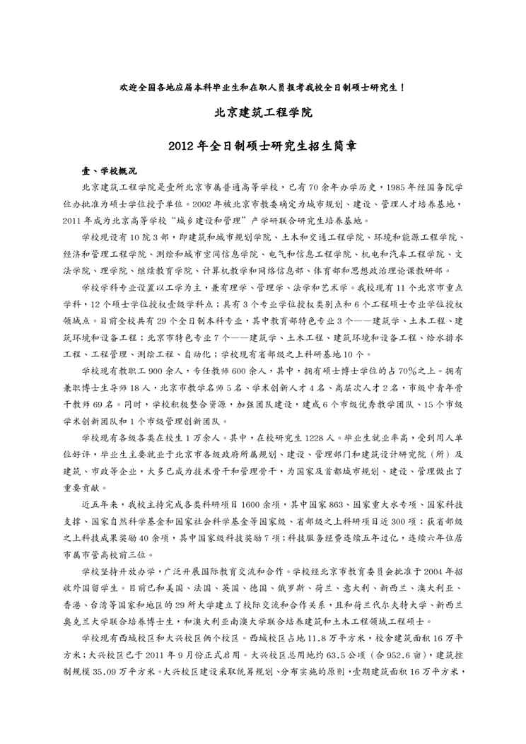 本站资深用户发布了最新的《(建筑工程管理)北京建筑工程学院年全日制硕士研究生招生简章》文档,以下内容为预览,详细内容可下载阅读。 声明:本站所有文章,如无特殊说明或标注,均为本站原创发布。任何个人或组织,在未征得本站同意时,禁止复制、盗用、采集、发布本站内容到任何网站、书籍等各类媒体平台。如若本站内容侵犯了原著者的合法权益,可联系我们进行处理。