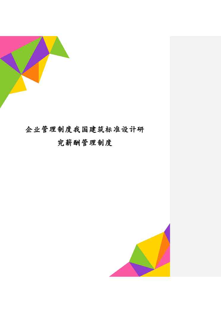 不久前,最新文档《企业管理制度我国建筑标准设计研究薪酬管理制度》全文正式在本站发布,感兴趣的用户可以下载阅读。 声明:本站所有文章,如无特殊说明或标注,均为本站原创发布。任何个人或组织,在未征得本站同意时,禁止复制、盗用、采集、发布本站内容到任何网站、书籍等各类媒体平台。如若本站内容侵犯了原著者的合法权益,可联系我们进行处理。