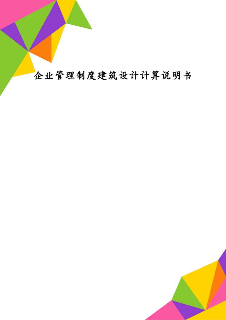 不久前,最新文档《企业管理制度建筑设计计算说明书》全文正式在本站发布,感兴趣的用户可以下载阅读。 声明:本站所有文章,如无特殊说明或标注,均为本站原创发布。任何个人或组织,在未征得本站同意时,禁止复制、盗用、采集、发布本站内容到任何网站、书籍等各类媒体平台。如若本站内容侵犯了原著者的合法权益,可联系我们进行处理。