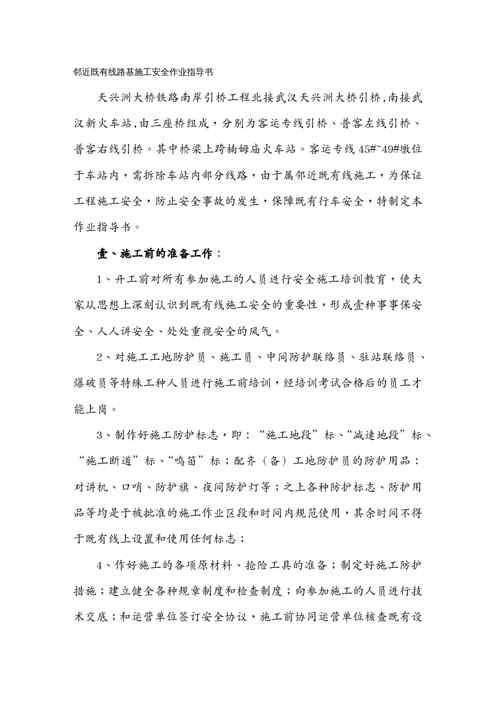 本站正式发布了《建筑工程安全邻近既有线路基施工安全作业指导书》文档,文档详细内容可下载阅读。 声明:本站所有文章,如无特殊说明或标注,均为本站原创发布。任何个人或组织,在未征得本站同意时,禁止复制、盗用、采集、发布本站内容到任何网站、书籍等各类媒体平台。如若本站内容侵犯了原著者的合法权益,可联系我们进行处理。