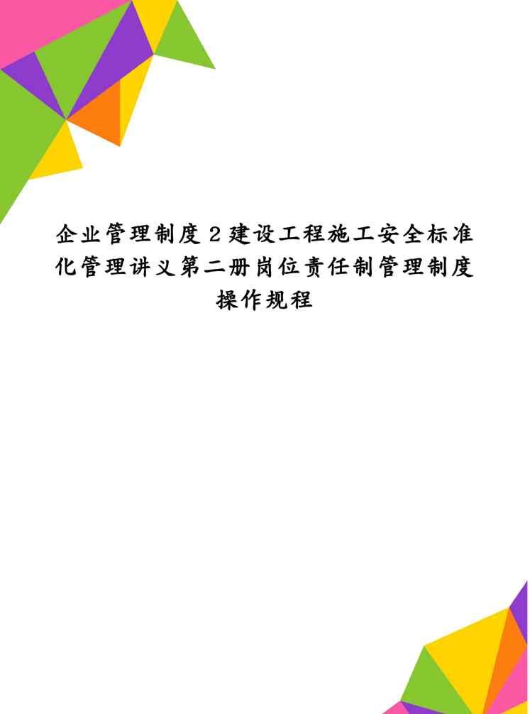 不久前,最新文档《企业管理制度2建设工程施工安全标准化管理讲义第二册岗位责任制管理制度操作规程》全文正式在本站发布,感兴趣的用户可以下载阅读。 声明:本站所有文章,如无特殊说明或标注,均为本站原创发布。任何个人或组织,在未征得本站同意时,禁止复制、盗用、采集、发布本站内容到任何网站、书籍等各类媒体平台。如若本站内容侵犯了原著者的合法权益,可联系我们进行处理。