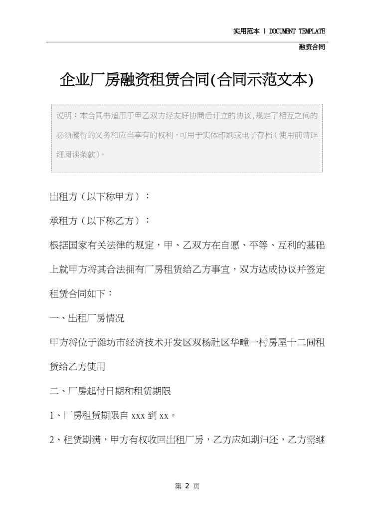 本站资深用户发布了最新的《企业厂房融资租赁合同(合同示范文本)》文档,以下内容为预览,详细内容可下载阅读。