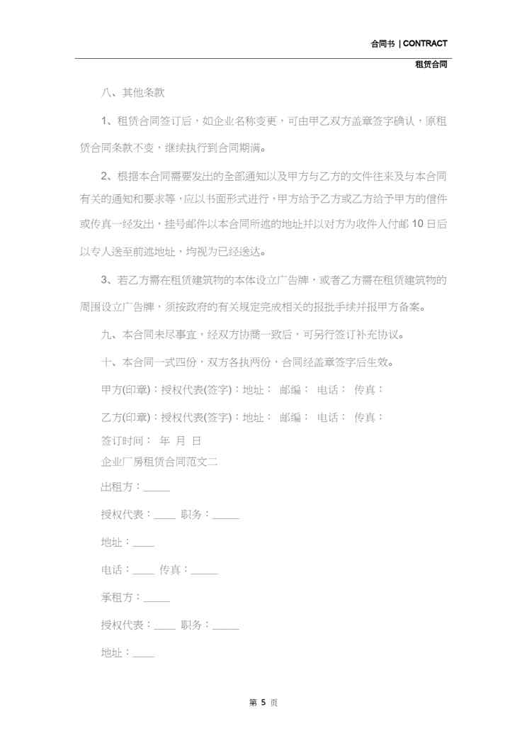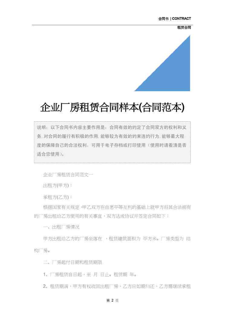 本站正式发布了《企业厂房租赁合同样本(合同范本)》文档,文档详细内容可下载阅读。 声明:本站所有文章,如无特殊说明或标注,均为本站原创发布。任何个人或组织,在未征得本站同意时,禁止复制、盗用、采集、发布本站内容到任何网站、书籍等各类媒体平台。如若本站内容侵犯了原著者的合法权益,可联系我们进行处理。