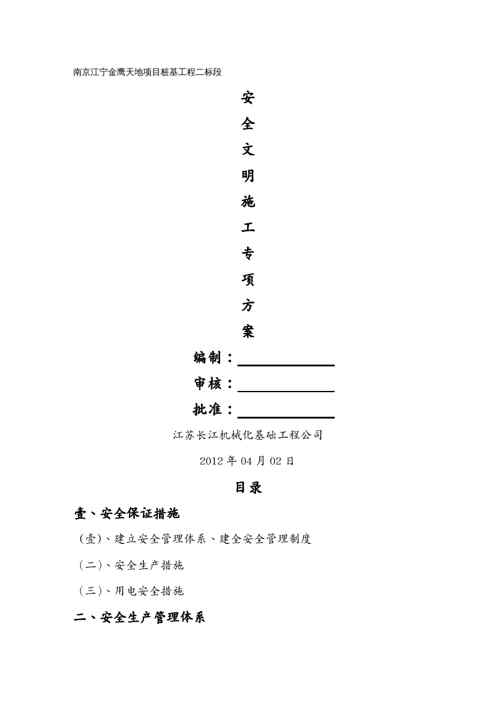 不久前,最新文档《建筑工程安全桩基工程安全文明施工方案》全文正式在本站发布,感兴趣的用户可以下载阅读。 声明:本站所有文章,如无特殊说明或标注,均为本站原创发布。任何个人或组织,在未征得本站同意时,禁止复制、盗用、采集、发布本站内容到任何网站、书籍等各类媒体平台。如若本站内容侵犯了原著者的合法权益,可联系我们进行处理。