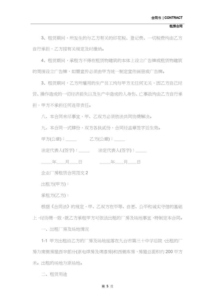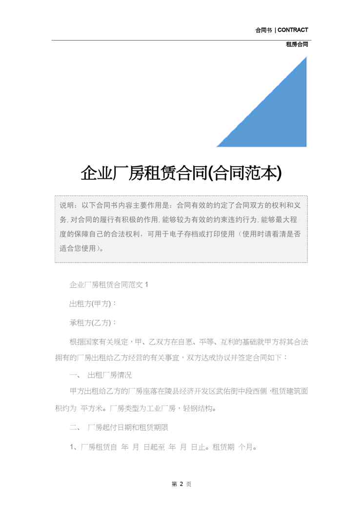 不久前,最新文档《企业厂房租赁合同(合同范本)》全文正式在本站发布,感兴趣的用户可以下载阅读。 声明:本站所有文章,如无特殊说明或标注,均为本站原创发布。任何个人或组织,在未征得本站同意时,禁止复制、盗用、采集、发布本站内容到任何网站、书籍等各类媒体平台。如若本站内容侵犯了原著者的合法权益,可联系我们进行处理。
