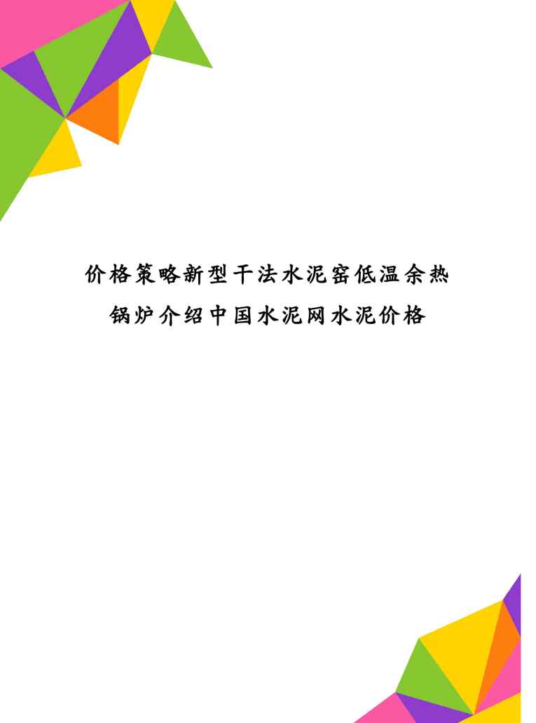 本站正式发布了《价格策略新型干法水泥窑低温余热锅炉介绍中国水泥网水泥价格》文档,文档详细内容可下载阅读。 声明:本站所有文章,如无特殊说明或标注,均为本站原创发布。任何个人或组织,在未征得本站同意时,禁止复制、盗用、采集、发布本站内容到任何网站、书籍等各类媒体平台。如若本站内容侵犯了原著者的合法权益,可联系我们进行处理。