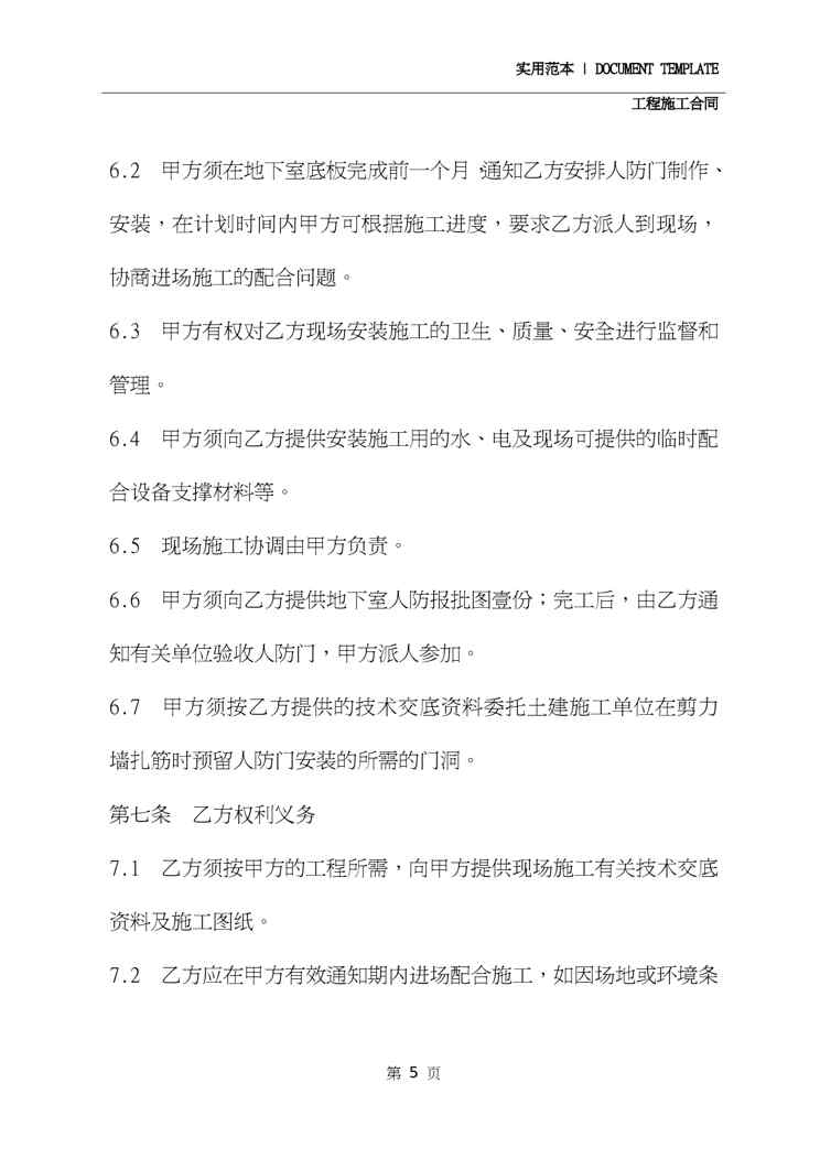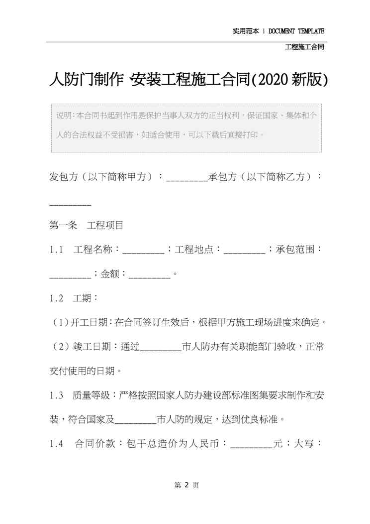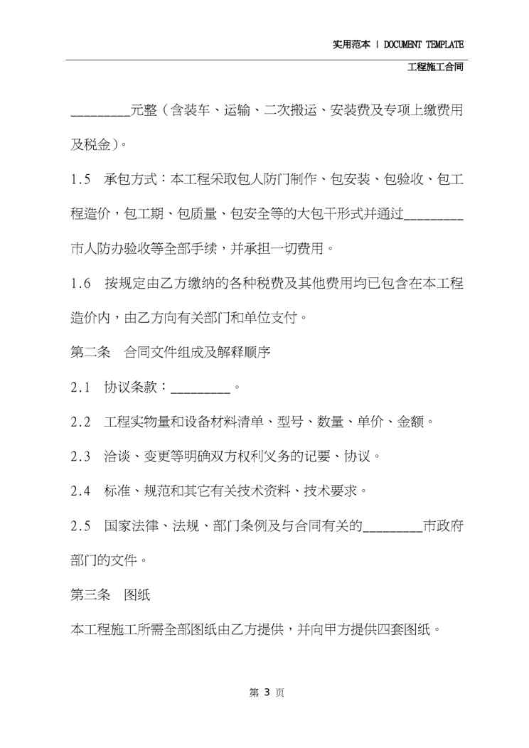 本站资深用户发布了最新的《人防门制作、安装工程施工合同详细版》文档,以下内容为预览,详细内容可下载阅读。 声明:本站所有文章,如无特殊说明或标注,均为本站原创发布。任何个人或组织,在未征得本站同意时,禁止复制、盗用、采集、发布本站内容到任何网站、书籍等各类媒体平台。如若本站内容侵犯了原著者的合法权益,可联系我们进行处理。