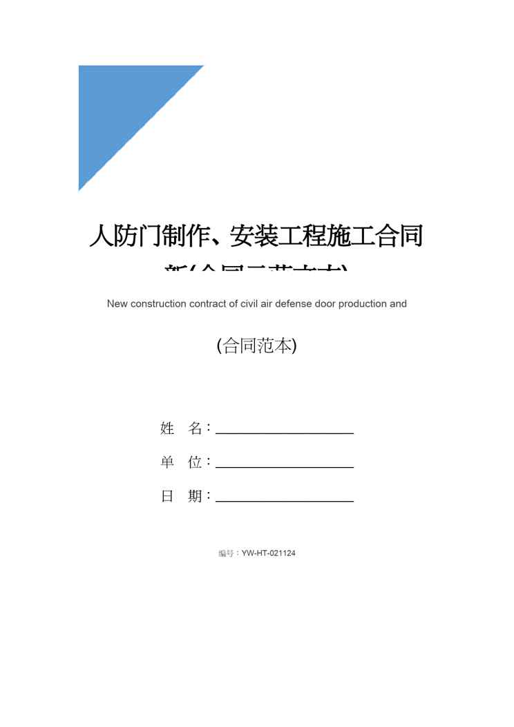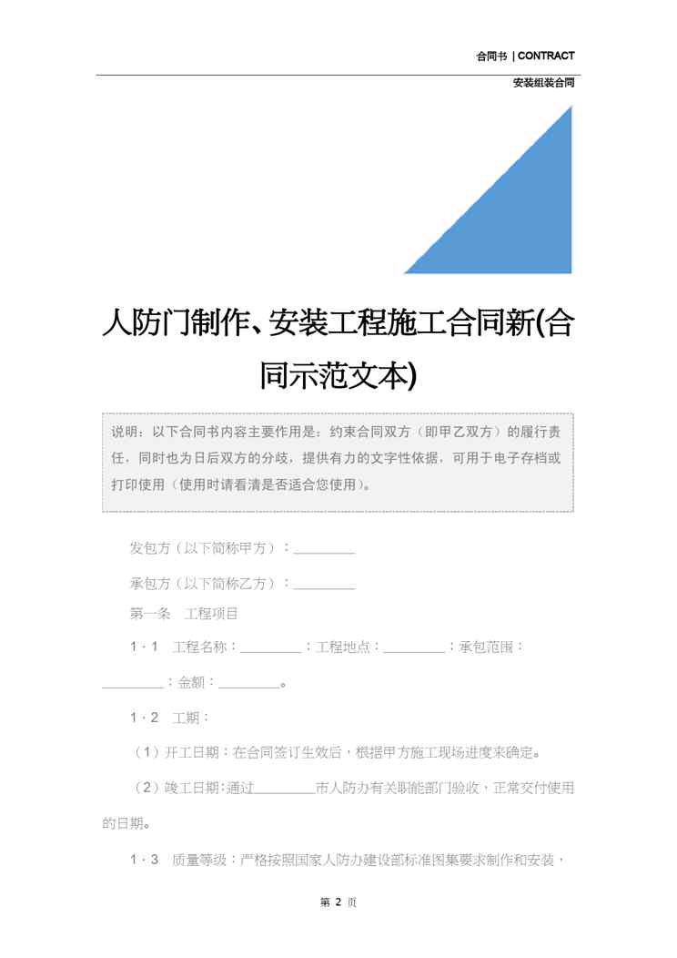 本站正式发布了《人防门制作、安装工程施工合同新(合同示范文本)》文档,文档详细内容可下载阅读。 声明:本站所有文章,如无特殊说明或标注,均为本站原创发布。任何个人或组织,在未征得本站同意时,禁止复制、盗用、采集、发布本站内容到任何网站、书籍等各类媒体平台。如若本站内容侵犯了原著者的合法权益,可联系我们进行处理。