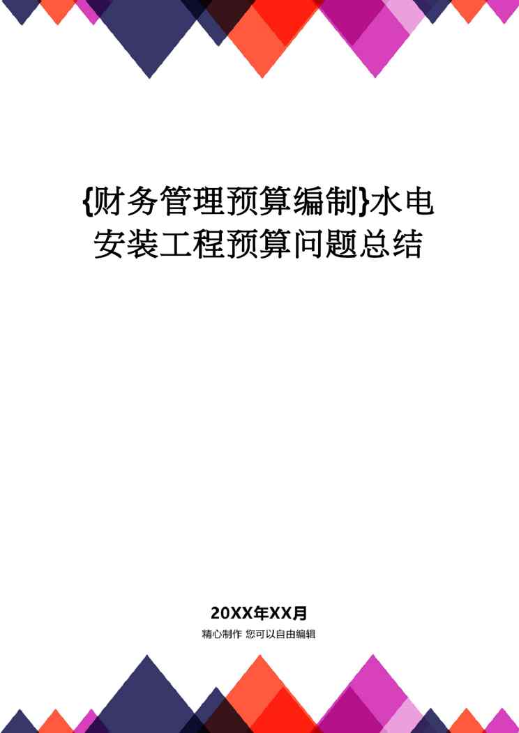 本站正式发布了《【财务管理预算编制 】水电安装工程预算问题总结》文档,文档详细内容可下载阅读。 声明:本站所有文章,如无特殊说明或标注,均为本站原创发布。任何个人或组织,在未征得本站同意时,禁止复制、盗用、采集、发布本站内容到任何网站、书籍等各类媒体平台。如若本站内容侵犯了原著者的合法权益,可联系我们进行处理。