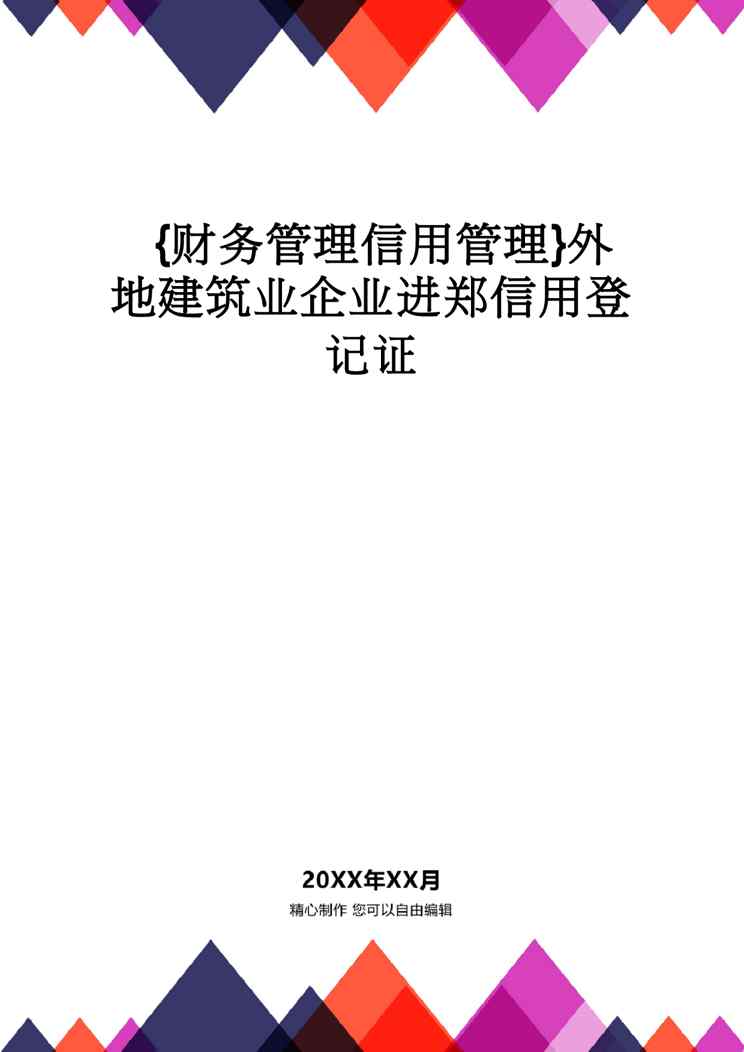 不久前,最新文档《【财务管理信用管理 】外地建筑业企业进郑信用登记证》全文正式在本站发布,感兴趣的用户可以下载阅读。 声明:本站所有文章,如无特殊说明或标注,均为本站原创发布。任何个人或组织,在未征得本站同意时,禁止复制、盗用、采集、发布本站内容到任何网站、书籍等各类媒体平台。如若本站内容侵犯了原著者的合法权益,可联系我们进行处理。