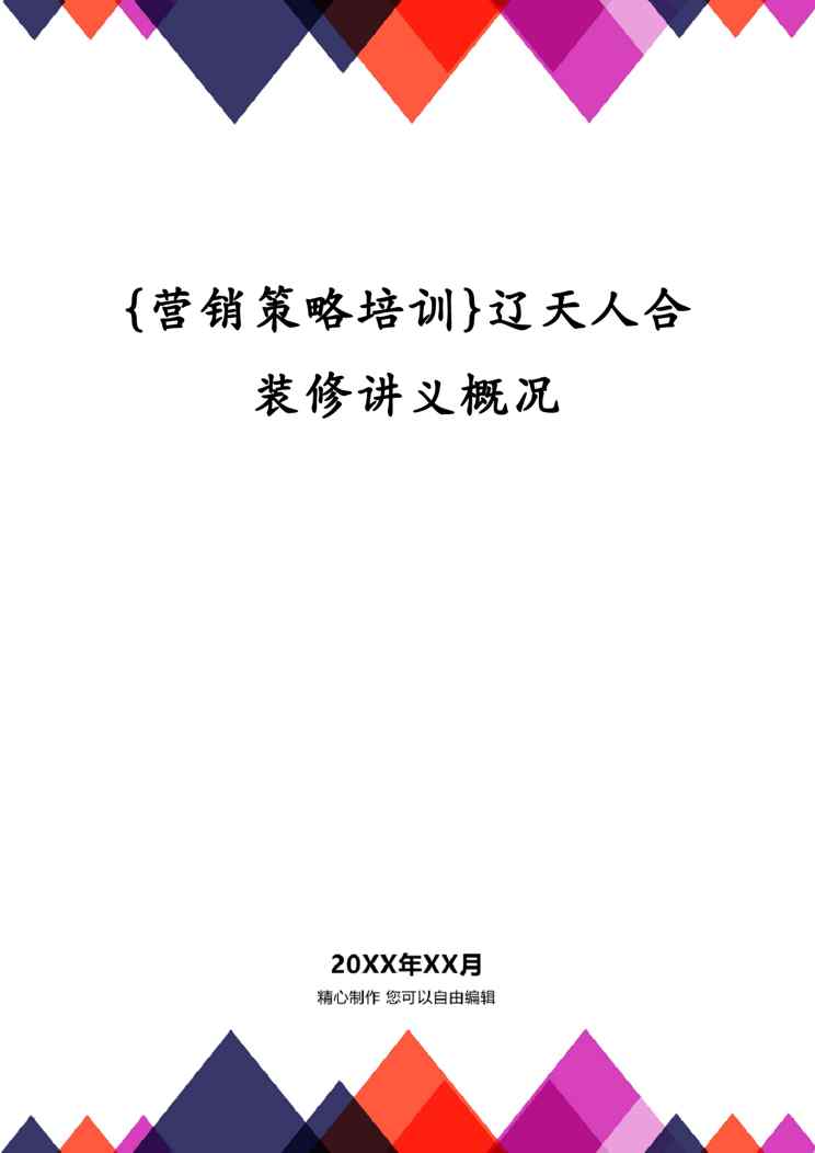 本站正式发布了《{营销策略培训}辽天人合装修讲义概况》文档,文档详细内容可下载阅读。 声明:本站所有文章,如无特殊说明或标注,均为本站原创发布。任何个人或组织,在未征得本站同意时,禁止复制、盗用、采集、发布本站内容到任何网站、书籍等各类媒体平台。如若本站内容侵犯了原著者的合法权益,可联系我们进行处理。