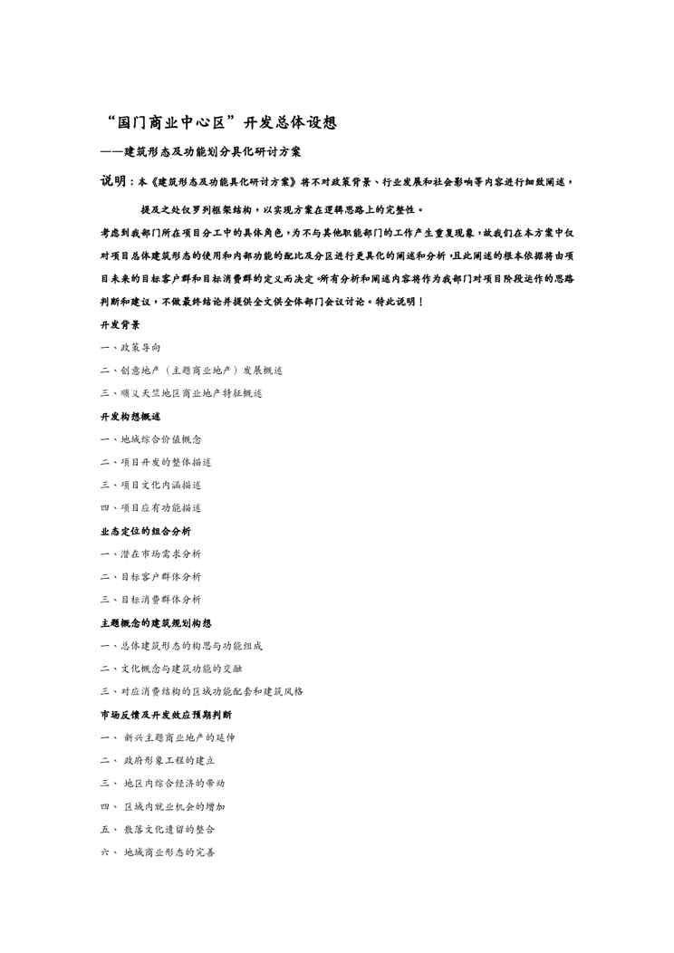 本站资深用户发布了最新的《{营销策略培训}国门商业中心区开发总体设想建筑形态及功能划分具化研讨方案》文档,以下内容为预览,详细内容可下载阅读。 声明:本站所有文章,如无特殊说明或标注,均为本站原创发布。任何个人或组织,在未征得本站同意时,禁止复制、盗用、采集、发布本站内容到任何网站、书籍等各类媒体平台。如若本站内容侵犯了原著者的合法权益,可联系我们进行处理。