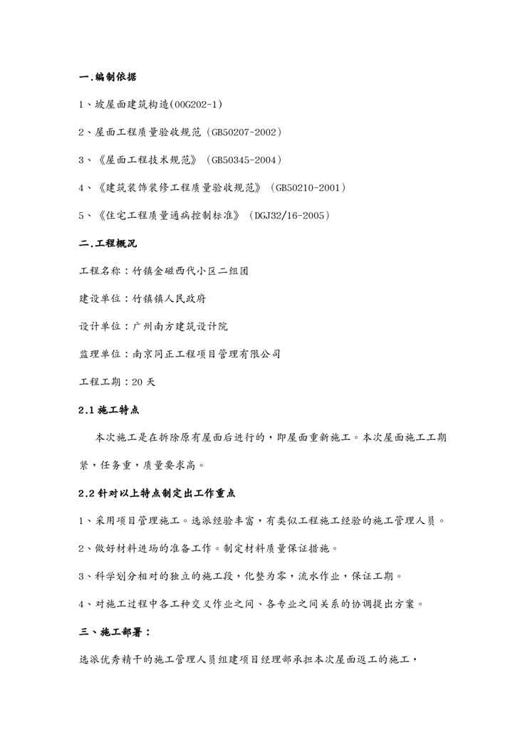 本站资深用户发布了最新的《{营销方案}竹镇二组团屋面施工方案》文档,以下内容为预览,详细内容可下载阅读。 声明:本站所有文章,如无特殊说明或标注,均为本站原创发布。任何个人或组织,在未征得本站同意时,禁止复制、盗用、采集、发布本站内容到任何网站、书籍等各类媒体平台。如若本站内容侵犯了原著者的合法权益,可联系我们进行处理。