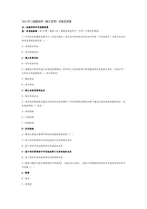 本站资深用户发布了最新的《建筑工程管理二级建设工程施工管理真题》文档,以下内容为预览,详细内容可下载阅读。 声明:本站所有文章,如无特殊说明或标注,均为本站原创发布。任何个人或组织,在未征得本站同意时,禁止复制、盗用、采集、发布本站内容到任何网站、书籍等各类媒体平台。如若本站内容侵犯了原著者的合法权益,可联系我们进行处理。