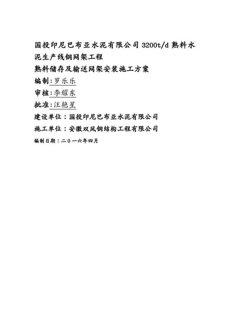 本站资深用户发布了最新的《{营销方案}熟料储存及输送网架安装施工方案》文档,以下内容为预览,详细内容可下载阅读。 声明:本站所有文章,如无特殊说明或标注,均为本站原创发布。任何个人或组织,在未征得本站同意时,禁止复制、盗用、采集、发布本站内容到任何网站、书籍等各类媒体平台。如若本站内容侵犯了原著者的合法权益,可联系我们进行处理。